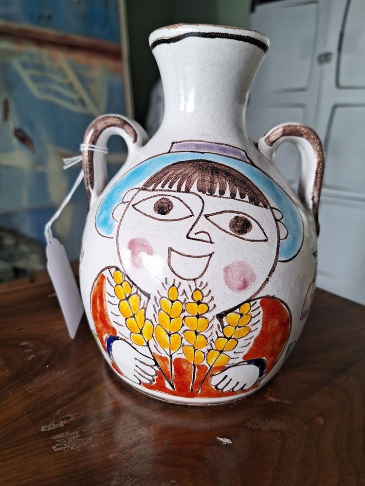 Giovanni de Simone (1930 - 1991) created wonderful ceramics like this charming vase in his studio that was founded in the 1960's in Palermo, Italy. Made of reddish tan clay, it's coated with white slip and hand painted in bold colors of red, blue, yellow, lavender and orange, with trim of speckled brown. Size: 7" x 5" Year: 1977