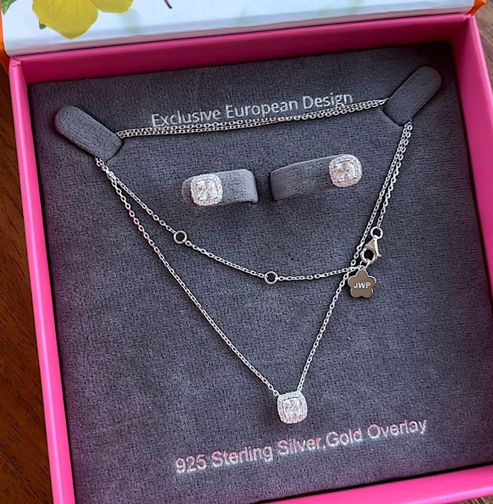 Add glamour to your day with these exquisite jewels! Finely crafted in .925 sterling silver with gold overlay. Hypoallergenic. The necklace measures 18 inches with adjustable length. Lobster clasp. A beautiful array of clear zirconia adorn the post earrings and the stunning pendant.